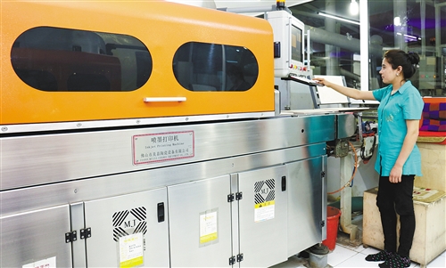 5月8日,在烏茲別克斯坦鵬盛工業(yè)園,鵬盛陶瓷公司員工操作噴墨打印機。工業(yè)園由中國溫州市金盛貿(mào)易有限公司投資建設,是首個中國民營企業(yè)在烏茲別克斯坦投資并被兩國政府認可、批準的項目。新華社記者 周 良攝