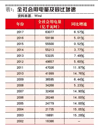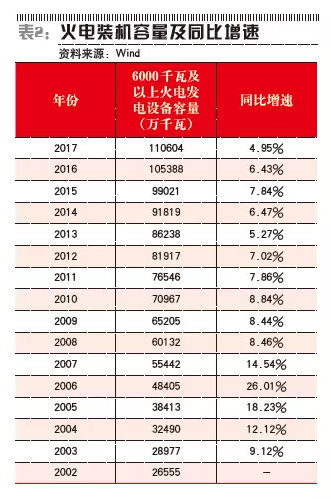 在煤電去產(chǎn)能大背景之下,如表2所示,2017年,火電裝機容量同比增幅只有4.95%,創(chuàng)下至少近20年以來新低。而在需求端,2017年全社會用電量同比增速達到6.57%,高于前者。