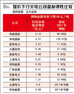 在低毛利率狀態(tài)下,相比利用小時數(shù),煤價對火電企業(yè)業(yè)績的彈性更大。據(jù)光大證券測算,利用小時數(shù)變動1%對毛利的影響是3%,煤價變動1%對毛利的影響是7%。如表6所示,按照光大證券的統(tǒng)計,煤價下行,火電公司盈利彈性最大的是華能國際和華電國際。