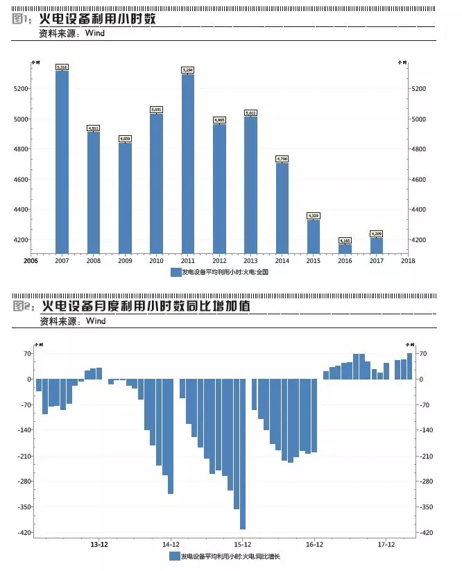 供需關(guān)系的此消彼長,使火電設(shè)備利用小時數(shù),終于在2017年結(jié)束了長達5年的下滑態(tài)勢,開始見底回升。2017年,火電設(shè)備利用小時數(shù)相比2016年增加了44個小時。