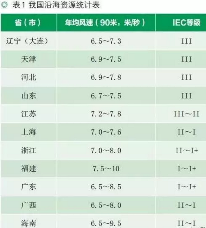 綜上所述,我國大部分近海海域90米高度年平均風速在7~8.5米/秒之間,具備較好的風能資源條件,適合大規(guī)模開發(fā)建設海上風電場。我國長江口以北的海域基本屬于IEC Ⅲ或Ⅱ類風電場,長江口以南的海域基本屬于IEC Ⅱ或Ⅰ類,局部地區(qū)為Ⅰ+類風電場。與Ⅰ類風電場相比,Ⅲ類風電場 50年一遇最大風速較低,適合選用更大轉輪直徑的機組。由于單位千瓦掃風面積的增加,同樣風速條件下,Ⅲ類風電場的發(fā)電量更高。風電場理想的風資源應該是具有較高的年平均風速和較低的50年一遇最大風速。因此,從風能資源優(yōu)劣和受臺風影響的角度考慮,長江口以北的海域更適合海上風電的發(fā)展。
