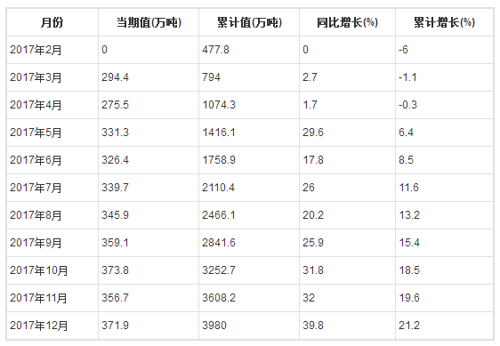 2017年12月全國石油瀝青產量為371.9萬噸,累計值為3980萬噸,同比增長39.8%,累計增長21.2%。