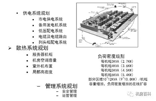 UPS電源主機(jī)、配電柜與蓄電池組是否需要分隔,按照數(shù)據(jù)中心等級的要求決定,另外還需要考慮到UPS屬于大型設(shè)備,重量比較大,噪聲大,需要擺放在一個承重比較好,并且不影響辦公和休息環(huán)境的地方。配電柜位置的選擇,主要考慮功能上的需求,配電柜應(yīng)在滿足功能分區(qū)的基礎(chǔ)上,盡可能靠近供電負(fù)載。發(fā)電機(jī)房宜設(shè)置在地面一層,當(dāng)發(fā)電機(jī)房設(shè)置于地下層時,應(yīng)特別注意進(jìn)、出風(fēng)通道能否滿足要求,應(yīng)注意發(fā)電機(jī)組儲油裝置(日用油箱、儲油罐)的消防要求。變配電所、發(fā)電機(jī)房、UPS電源機(jī)房均應(yīng)留有足夠的面積,可與設(shè)備機(jī)房同步發(fā)展,應(yīng)對設(shè)備機(jī)房面積擴(kuò)展或設(shè)備機(jī)房功率密度上升引起的供電需求。于非專門設(shè)計用于數(shù)據(jù)中心的建筑,應(yīng)注意其是否滿足設(shè)備安裝和線路敷設(shè)的要求,包括樓面荷載、凈高、抗震等級、耐火等級等方面。