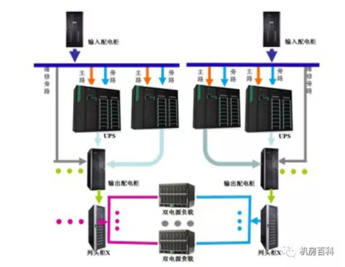 雙總線供電方式是采用兩條總線對后端設(shè)備進(jìn)行供電,每條總線上具有相同的一套UPS供電方式,消除可能出現(xiàn)在UPS輸出端與最終用戶負(fù)載端之間的“單點(diǎn)瓶頸”故障隱患,以提高輸出電源供電系統(tǒng)的“容錯”功能。此供電方式能夠在線維護(hù),在線擴(kuò)容,在線升級,改善了重要總線的可用性,滿足了雙電源用電設(shè)備的需求,真正實(shí)現(xiàn)了7×24×365運(yùn)行的目標(biāo)。但是雙總線冗余供電方式相當(dāng)于搭建了兩套前述供電方式的回路,需要增加2倍以上的成本。同時,為滿足單電源設(shè)備的供電需求,可在輸出端安裝STS,來保證供電輸出的可靠性。