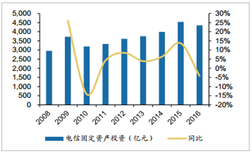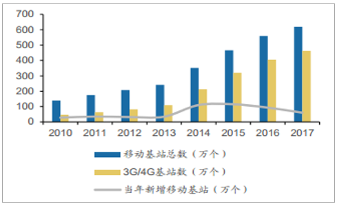 電信行業(yè)是低壓電器的重要用戶,是中高端產品最重要的應用領域之一,要求設備的穩(wěn)定性高,環(huán)境適應性強。我國是世界上電信用戶最多的國家,多年來電信業(yè)固定資產的投資額均保持在較高水平。 2016年我國電信固定資產投資4350億元,2008年到2016年期間投資額復合增速為4.96%。截至2017年底我國現(xiàn)有移動基站619萬座,其中3G/4G基站有462萬座,約占75%,自2013年4G網絡普及以來,新增基站以4G為主。 2018年4月,我國開始啟動5G網絡試點,預計2019年到2020年可實現(xiàn)商業(yè)運營, 這期間對現(xiàn)有基站的升級改造以及5G基站的建造將為低壓電器帶來相當可觀的市場。通信基站建設使用的產品一般以高端產品為主。