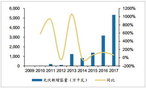 在光伏裝機方面,光伏組件成本的快速降低推動了光伏裝機的高增長, 2011年組件價格超過12元/W,到2017年組件的價格約為3元/W,下降明顯。另外,國家在光伏上網電價方面也在持續(xù)下調,企業(yè)為了能拿到更高的電價也在積極進行“搶裝”。2017年全國新增光伏發(fā)電裝機容量5306萬千瓦,同比增長53.6%;全國光伏發(fā)電量1182億千瓦時,同比增加78.6%。