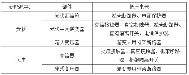 低壓電器是新能源發(fā)電及并網設備的重要組成部分,光伏系統(tǒng)中的光伏匯流箱、光伏并網逆變器、箱式變壓器以及風電系統(tǒng)中的變流器、箱式變壓器都存在較大的低壓電器的需求。