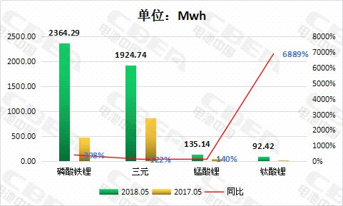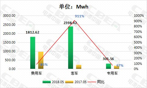 動力電池應用分會研究部最新統(tǒng)計數據顯示,2018年5月國內新能源汽車市場動力電池裝機量為4516.59Mwh(4.52GWh),同比增長223%,環(huán)比增長22%。從各類車型同比增速來看,各類車型同比增速對比4月都有所下降(4月各類車型同比增長分別為乘用車189.01%、客車2075.13%、專用車100.55%)。