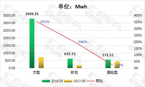 圖4:2018年5月不同外形電池的裝機量統(tǒng)計及同比