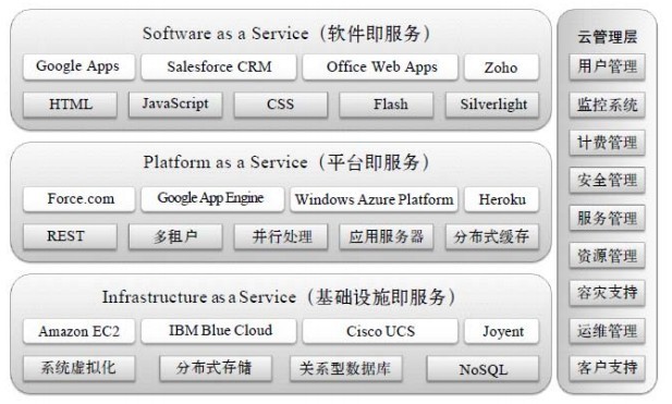 云計算架構(gòu)分為服務(wù)和管理兩大部分。在服務(wù)方面,主要以提供用戶基于云的各種服務(wù)為主,共包含3個層次:基礎(chǔ)設(shè)施即服務(wù)IaaS、平臺即服務(wù)PaaS、軟件即服務(wù)SaaS。在管理方面,主要以云的管理層為主,它的功能是確保整個云計算中心能夠安全、穩(wěn)定地運行,并且能夠被有效管理。其總體架構(gòu)如下圖。