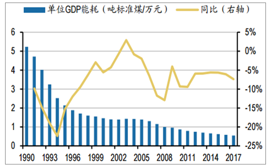 2017年我國單位GDP能耗0.54噸標準煤/萬元,同比下滑7.38%