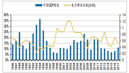 我國第三產(chǎn)業(yè)GDP比重逐年提升,2017年我國第三產(chǎn)業(yè)GDP占比達51.6%,較2016年不變,較2000年提升11.8個百分點,而服務業(yè)耗電量僅為工業(yè)耗電量的八分之一到十分之一,導致我國單位GDP能耗呈現(xiàn)下降趨勢,2017年我國單位GDP能耗0.54噸標準煤/萬元,同比下滑7.38%,較2000年下滑62.96%。電力彈性系數(shù)方面,世界銀行預計2018/19/20年GDP增速6.4%/6.3%/6.2%,2017年GDP增速為6.9%,經(jīng)濟增速穩(wěn)中趨緊,而2017年中國電力彈性系數(shù)為0.51,預計2018-2020年維持在0.5-0.6水平。