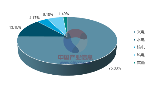 火電、水電、核電、風電分別占比75.08%、13.15%、4.17%、6.1%