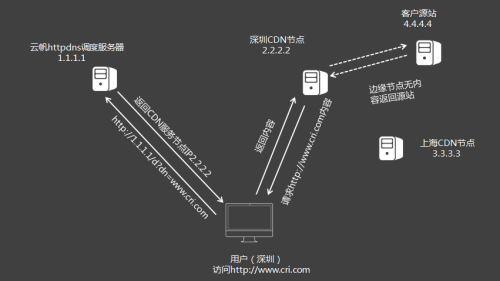 我們可以形象地把它比喻成云帆加速 CDN服務(wù)的導(dǎo)航,當(dāng)它發(fā)現(xiàn)CDN網(wǎng)絡(luò)中有節(jié)點(diǎn)出現(xiàn)故障而不能正常服務(wù)或服務(wù)質(zhì)量下降的時(shí)候,能立即將用戶(hù)的訪問(wèn)轉(zhuǎn)向網(wǎng)絡(luò)中其它正常的節(jié)點(diǎn)上,從而保證用戶(hù)訪問(wèn)的持續(xù)和穩(wěn)定。