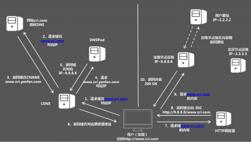 云帆加速自主開(kāi)發(fā)的支持HTTP協(xié)議的定向模塊能根據(jù)用戶(hù)的IP地址,確定用戶(hù)的準(zhǔn)確來(lái)源,并按照流量調(diào)度策略將用戶(hù)通過(guò)HTTP重定向協(xié)議(302/301)