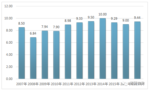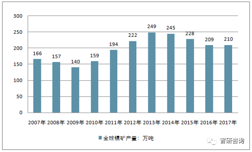 2007-2017年全球鎳礦產(chǎn)量走勢