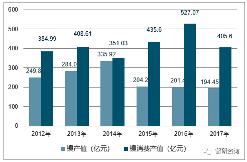 2017年中國鎳產(chǎn)值為194.45億元,同比下降3.45%;2016年中國鎳產(chǎn)值為201.4億元。2017年中國鎳消費(fèi)產(chǎn)值為405.6億元,同比下降23.05%;2016年中國鎳消費(fèi)產(chǎn)值為527.07億元。