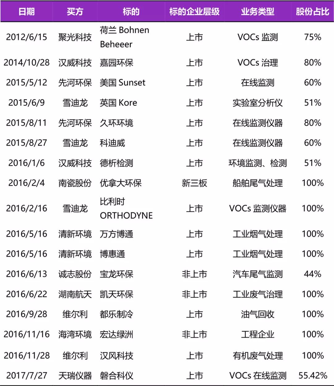 表VOCs監(jiān)測及治理領(lǐng)域并購案例列表