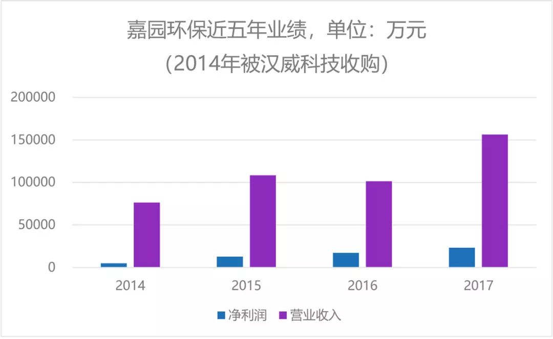 2014年,漢威科技做了在環(huán)保領(lǐng)域的最重要的一項收購:以4.4億元收購環(huán)境治理企業(yè)(VOCs治理)嘉園環(huán)保80%股權(quán)。收購的一年,嘉園環(huán)保的凈利潤為2414.6萬元,以此計算收購P/E為22.8倍,價格不菲。交易附帶業(yè)績對賭條款,即在2014~2016年間,嘉園環(huán)保凈利潤分別不低于3353.20萬元、4289.34萬元、5252.41萬元。