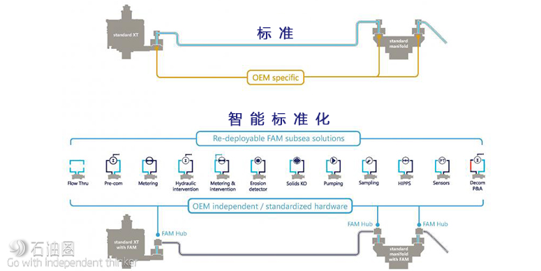 通過將海底核心設(shè)備與提高產(chǎn)量設(shè)備分離,F(xiàn)AM技術(shù)相比于標(biāo)準(zhǔn)方法有幾個(gè)優(yōu)勢。FAMs的可用范圍廣泛,可以在油田壽命期間任何時(shí)候部署應(yīng)用模塊。由于協(xié)同設(shè)計(jì),作業(yè)者可在項(xiàng)目的早期階段就為基礎(chǔ)設(shè)施定下長期的購買訂單。FAM技術(shù)可以部署在采油樹的跨接管線或出油管線、管線末端管匯、管線末端終端或簡易管匯的任一端。