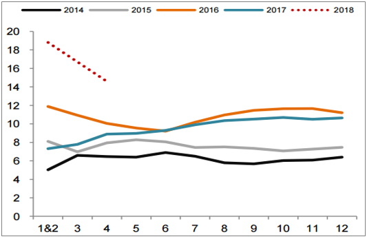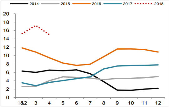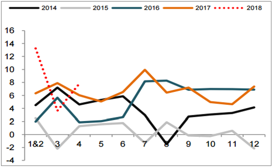 2014-2018國(guó)內(nèi)月度用電量增速統(tǒng)計(jì)(百分比)