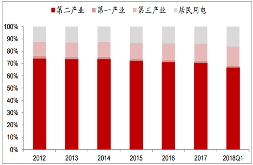 2012-2018Q1國(guó)內(nèi)細(xì)分產(chǎn)業(yè)用電量占比統(tǒng)計(jì)