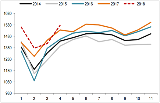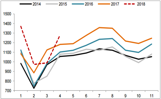 2014-2018國(guó)內(nèi)月度用電量統(tǒng)計(jì)(億度)