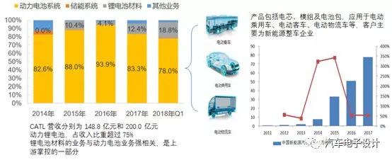 對于一個鋰電企業(yè)而言,它本身的產(chǎn)品是需要由汽車和其他領(lǐng)域的客戶所集成和應用,其最終的業(yè)績也是取決于鋰電池產(chǎn)品的技術(shù)發(fā)展的成熟度,所以我們首先來看它的核心市場。從2014年開始,由于中國新能源汽車的快速起飛,使得CATL的主要產(chǎn)品還是圍繞這個主體不斷增長。在這個增長數(shù)字的背后是相應的財政補貼和地方政府對于新能源汽車的偏向,產(chǎn)業(yè)支持力度很大。在這個大前提下,整個業(yè)務的持續(xù)性是健康的。
