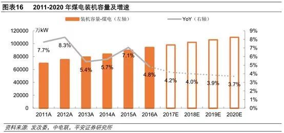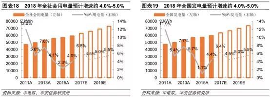 電力工業(yè)作為國民經(jīng)濟運轉的支柱之一,供需關系的變化在較大程度上受到宏觀經(jīng)濟運行狀態(tài)的影響?紤]到2018年投資領域中房地產(chǎn)與基建的負面影響,我們預測2018年GDP增速將小幅回落至6.6%,相比2017年同比下降約0.2個百分點。參考2016年的GDP增速變化與全社會用電量及全國發(fā)電量之間的關系,我們預計2018年用電量及發(fā)電量的增速在4.0%-5.0%區(qū)間內。