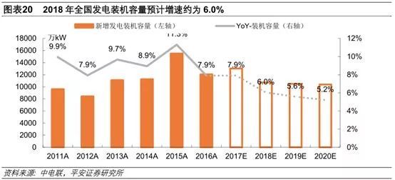 根據(jù)我們對水電、火電、核電、風電、光伏這5種主要電源類型裝機容量的統(tǒng)計和測算,我們預計2018年全國發(fā)電裝機容量同比增速約為6.0%。