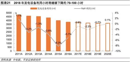 假設當年新增發(fā)電裝機容量的利用小時為全年平均利用小時的一半,根據(jù)計算結果,2018年發(fā)電設備利用小時將繼續(xù)下降約70-100小時。