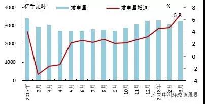 2018年3月,歐洲OECD國家發(fā)電量為3262億千瓦時,同比增長6.8%,增速比上月提高2.1個百分點,環(huán)比增長4.4%。