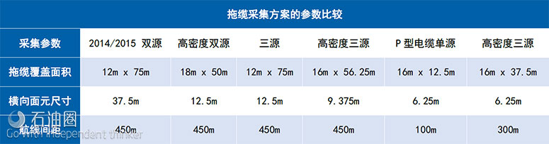 表1.前四列的航線間距相同;而針對P型電纜和高密度三源,大幅減小了橫向面元尺寸。