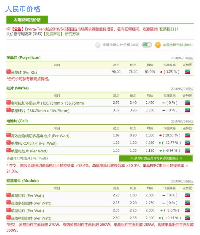 本周組件市場趨勢與上周類似,一般多晶組件的成交價大多可站上RMB 2/W,整體多晶組件的成交價則大致在RMB2.0~2.35/W區(qū)間。單晶組件價格則因上游電池片降價而跟著補跌,目前一般單晶組件價位下滑至RMB 2.25~2.35/W,高效單晶跌幅更深,到了RMB2.35~2.50/W。海外市場的成交價變化不大,可能是因海外市場仍以交付既有訂單有關(guān)。