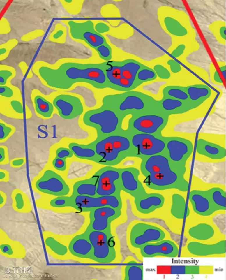 為了方便后續(xù)操作,需要在所識(shí)別的紅色和藍(lán)色異常區(qū)內(nèi)確定井位。研究人員根據(jù)獨(dú)立的地球動(dòng)力學(xué)模型分析、地震數(shù)據(jù)和DDT勘查結(jié)果,判斷高強(qiáng)度異常區(qū)與高度斷裂的局部區(qū)域?qū)?yīng)。該勘查技術(shù)不僅可識(shí)別現(xiàn)有的區(qū)域和構(gòu)造,還可精確顯示含油氣區(qū)域和構(gòu)造,這比其他勘查方法更優(yōu)越。