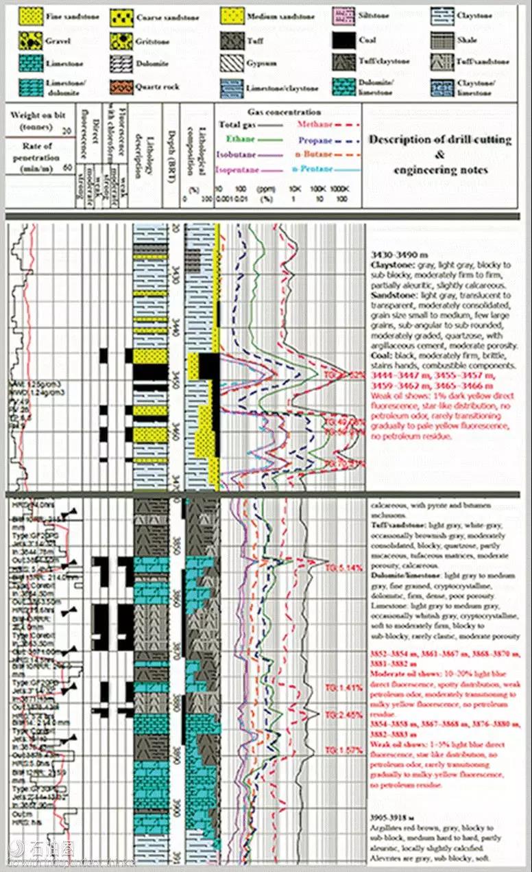 2017年,在上述地點(diǎn)完成了No.42井,完鉆井深3962 m。期間進(jìn)行了電測(cè),數(shù)據(jù)顯示,第1個(gè)明顯的產(chǎn)氣層位于2420 m,這與煤層有關(guān);油層位于3450和3900 m處。這些數(shù)據(jù)與基于第二階段勘查數(shù)據(jù)和分析的三維區(qū)塊圖中顯示的深度相符。作業(yè)人員挑揀出了各地層最具代表性的巖屑,并繪制在了巖性測(cè)井曲線上,如圖6。