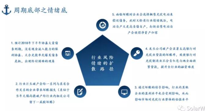 4. 光伏制造業(yè)企業(yè)拋售電站自產(chǎn);遭遇債務(wù)危機(jī)時(shí),債權(quán)人會(huì)想到拋售電站獲得現(xiàn)金流以償還債務(wù),當(dāng)被迫出售電站時(shí),又恰逢行業(yè)情緒的低谷,所以電站出售價(jià)格勢(shì)必不理想,電站自產(chǎn)多屬于高負(fù)債自產(chǎn)(電站自產(chǎn)負(fù)債率動(dòng)輒80%)同時(shí)國(guó)內(nèi)約三分之二的光伏電站補(bǔ)貼并沒(méi)有到位(現(xiàn)金流不理想),在拋售電站時(shí)只要打八折,凈資產(chǎn)就會(huì)被歸零。行業(yè)內(nèi)持有大量光伏電站的制造業(yè)企業(yè)不在少數(shù)。電站資產(chǎn)打折出售會(huì)使得電站擁有方嚴(yán)重受傷。