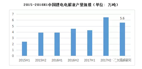 2018年上半年電解液總產(chǎn)量為5.6萬(wàn)噸,同比增長(zhǎng)30%。電解液原材料六氟磷酸鋰產(chǎn)能釋放,價(jià)格降至10-12萬(wàn)/噸,電解液價(jià)格目前仍維持小幅度下滑,主要受六氟磷酸鋰下滑,溶劑價(jià)格下滑,電解液行業(yè)集中競(jìng)爭(zhēng)加大等因素影響,毛利目前處于低谷。