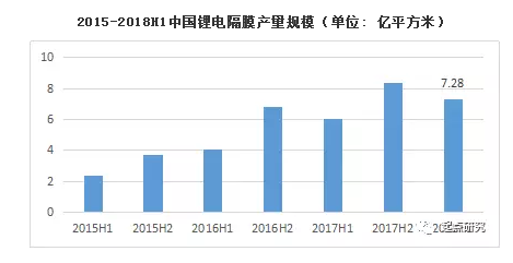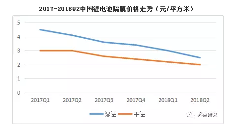 2018年上半年隔膜總產(chǎn)量為7.6億平方米,同比增長(zhǎng)18.8%。濕法隔膜行業(yè)競(jìng)爭(zhēng)激烈,去年濕法線擴(kuò)產(chǎn)過(guò)多,產(chǎn)能利用率低,行業(yè)價(jià)格戰(zhàn)盛行。為更好的減低電池成本,大型電池企業(yè)由原先濕法隔膜開(kāi)始向干法隔膜轉(zhuǎn)換,隔膜市場(chǎng)總體價(jià)格再度下滑,干法單拉跌至1.8元/平米,濕法跌至2.0-2.3元/平米。