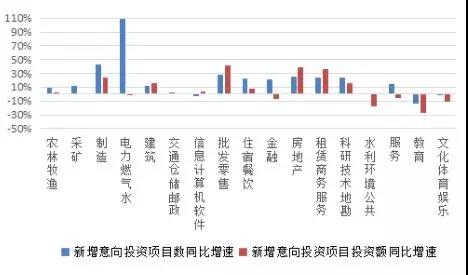 圖3 各行業(yè)新增意向投資項目數(shù)、投資額同比增長情況