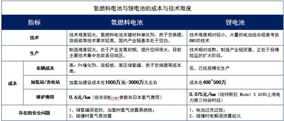 若從兩者的技術(shù)難度與成本來看,鋰電池技術(shù)難度相對較小,生產(chǎn)相對成熟,同時整個制造產(chǎn)業(yè)鏈完善,正處于規(guī)模效應(yīng)的擴大階段,而氫燃料電池的關(guān)鍵材料催化劑、質(zhì)子交換膜、雙極板等國內(nèi)產(chǎn)業(yè)鏈基本處于空白狀態(tài),同時制造成本及加氫站建設(shè)成本等高昂。