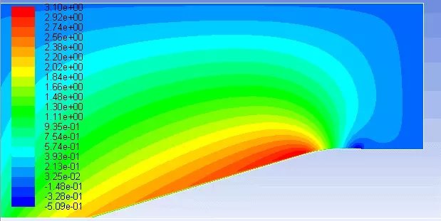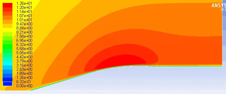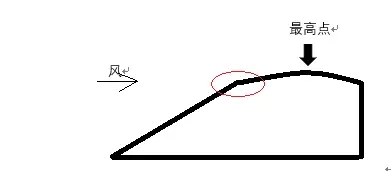 通過CFD對該地形進(jìn)行模擬(下圖左方為上風(fēng)向),發(fā)現(xiàn)風(fēng)速最大的地方位于山坡與山頂拐角處。該位置壓力分布也是最大區(qū)域。風(fēng)吹向山坡時(shí),近地層空氣被壓縮,風(fēng)速增大,當(dāng)?shù)竭_(dá)山頂時(shí),地形突變,空氣不再被壓縮,風(fēng)速不再增加,甚至在后方形成渦流,降低風(fēng)速。