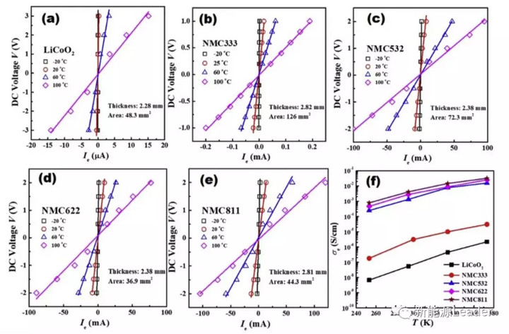 通常而言提升動力電池倍率性能主要是從材料的選擇上入手,例如我們之前曾在文章《離子導(dǎo)電、電子導(dǎo)電傻傻分不清楚?你想知道的都在這里!》介紹過目前常見的高鎳三元材料與傳統(tǒng)的鈷酸鋰材料的離子和電子電導(dǎo)率對比【1】,常溫20℃下,LCO材料的電子電導(dǎo)率最低僅為5x10-8S/cm,而NCM111材料電子電導(dǎo)率可達(dá)2.2x10-6S/cm,隨著鎳含量的進(jìn)一步提高,三元材料的電子電導(dǎo)率也明顯提高,NCM8111材料的電子電導(dǎo)率更是達(dá)到4.1x10-3S/cm,離子電導(dǎo)率方面也表現(xiàn)出了同樣的趨勢,LCO材料在20℃下,離子電導(dǎo)率僅為2.3x10-7S/cm,而NCM111材料離子電導(dǎo)率為3.2x10-6S/cm,NCM532位1.7x10-3S/cm,NCM622位3.4x10-3S/cm,NCM811材料更是達(dá)到了6.3x10-3S/cm,因此無論是從電子電導(dǎo)率還是離子電導(dǎo)率上來看三元材料,特別是高鎳三元材料或者NCA材料都更加適合倍率型鋰離子電池,當(dāng)然除了材料的這些本征特性外,其倍率性能還受到形貌等多重因素的影響,例如小顆粒的材料表面積更大,Li+在顆粒內(nèi)部的擴(kuò)散距離更短,因此理論上會具有更好的倍率性能。