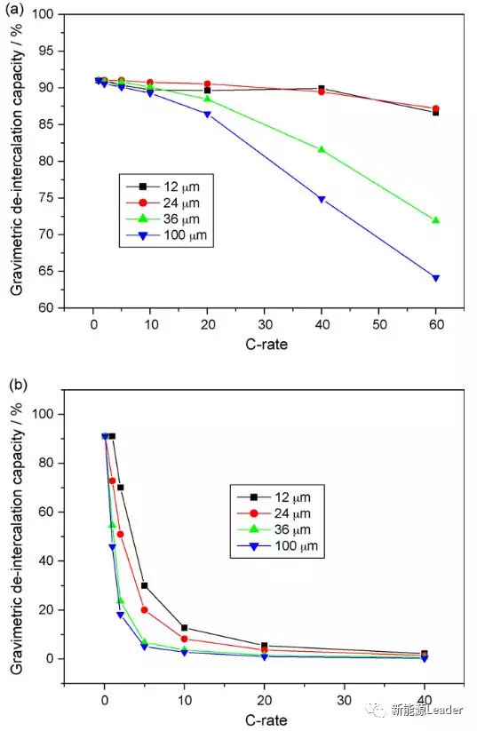 負(fù)極材料的選擇種類比較多,例如小顆粒的中間相類的石墨材料,在倍率性能上都有較好的表現(xiàn),澳大利亞聯(lián)邦科學(xué)與工業(yè)組織(CSIRO)的能源技術(shù)部S.R. Sivakkumar, J.Y. Nerkar,A.G. Pandolfo【5】對不同類型和粒徑的石墨材料進(jìn)行評估表明,石墨材料的顆粒粒徑越小則倍率性能越高,降低石墨表面涂層厚度也能夠提升石墨負(fù)極的倍率性能。但是粒徑縮小也帶來了一系列的問題,例如可逆容容量的降低和壓實密度的下降,同時研究也表明雖然上述措施能夠提高石墨負(fù)極的放電倍率性能,但是卻難以有效的提升石墨負(fù)極的充電倍率性能。