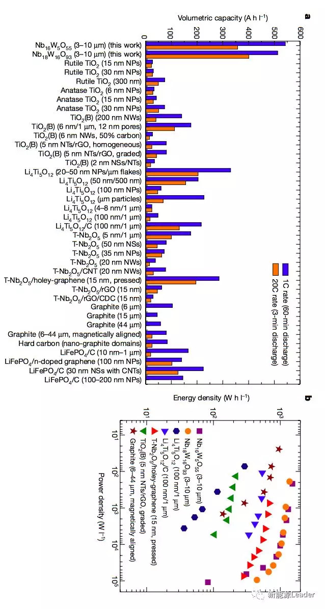 Li4Ti5O12材料本身具有較高的Li+擴(kuò)散系數(shù)(10-16-10-15m2/S)【2】,同時鈦酸鋰電池材料因為電導(dǎo)率較低,生產(chǎn)中往往會制成納米級的顆粒,因此進(jìn)一步增大了活性面積,降低了Li+的擴(kuò)散距離,鈦酸鋰電池因此具有非常優(yōu)異的倍率性能,能夠?qū)崿F(xiàn)快速充電,這也正是董明珠看中銀隆的原因,然而鈦酸鋰材料的電壓平臺為1.55V,理論可逆容量為170mAh/g,導(dǎo)致電池比能量較低,嚴(yán)重影響了電動汽車的續(xù)航里程,這也是導(dǎo)致銀隆近期陷入危機(jī)的根源所在,正所謂成也蕭何,敗也蕭何。為了解決鈦酸鋰存在的這些問題,同時保留其高倍率性能的優(yōu)勢,科研工作者做了大量的努力,日本東芝公司【3】開發(fā)的鈮鈦氧化合物NTO新型負(fù)極材料,該材料的可逆容量可達(dá)341mAh/g遠(yuǎn)遠(yuǎn)高于LTO材料,接近石墨材料,但是憑借著高壓實密度的優(yōu)勢,在體積能量密度達(dá)到了石墨負(fù)極的兩倍,同時該材料還保留了快速充電的特性,從0%SoC充電到90%SoC最快僅僅需要6min,幾乎完美滿足了電動汽車的需求,目前東芝公司已經(jīng)宣布和雙日公司Sojitz、巴西礦山公司CBMM達(dá)成了合作協(xié)議,共同開發(fā)生產(chǎn)該材料。