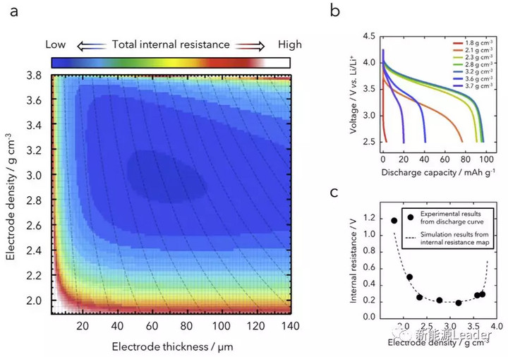 單純的做到高倍率性能并不難,難就難在倍率性能與能量密度的兼顧,一般而言倍率性能和能量密度之間是相互矛盾的,在兩者之間找到一個平衡是非常困難的,日本東京農(nóng)工大學(xué)的Kazuaki Kisu等【7】通過分析不同涂布厚度和壓實密度的NCM電極的阻抗的方式得到了最佳的涂布厚度和壓實密度的組合(70um和2.9g/cm3),在壓實密度過高時會導(dǎo)致電極孔隙率急劇下降,導(dǎo)致離子擴(kuò)散阻抗增加,而壓實密度較低時又會導(dǎo)致接觸阻抗的增加,因此只有合適的壓實密度才能在保證鋰離子電池優(yōu)異的倍率性能的同時也兼顧了高能量密度的特性。