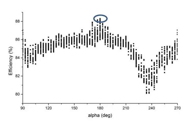 由圖中數(shù)據(jù)可見風(fēng)向偏轉(zhuǎn)對(duì)年等效滿發(fā)小時(shí)數(shù)影響之大,方案2最終成為最優(yōu)機(jī)位排布方案。