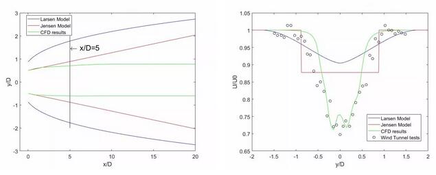 目前,機(jī)位排布主要通過(guò)經(jīng)驗(yàn)公式計(jì)算尾流場(chǎng)分布,不同的經(jīng)驗(yàn)公式計(jì)算得出的尾流場(chǎng)有極大偏差。下圖為Jensen尾流模型與Larsen尾流模型計(jì)算得出的尾流場(chǎng)分布,呈現(xiàn)出了不同的結(jié)果。經(jīng)驗(yàn)公式所描繪的尾流場(chǎng)分布與海上風(fēng)場(chǎng)實(shí)際尾流分布不一致是導(dǎo)致風(fēng)場(chǎng)實(shí)際發(fā)電量與計(jì)算發(fā)電量偏差較大的主要原因。