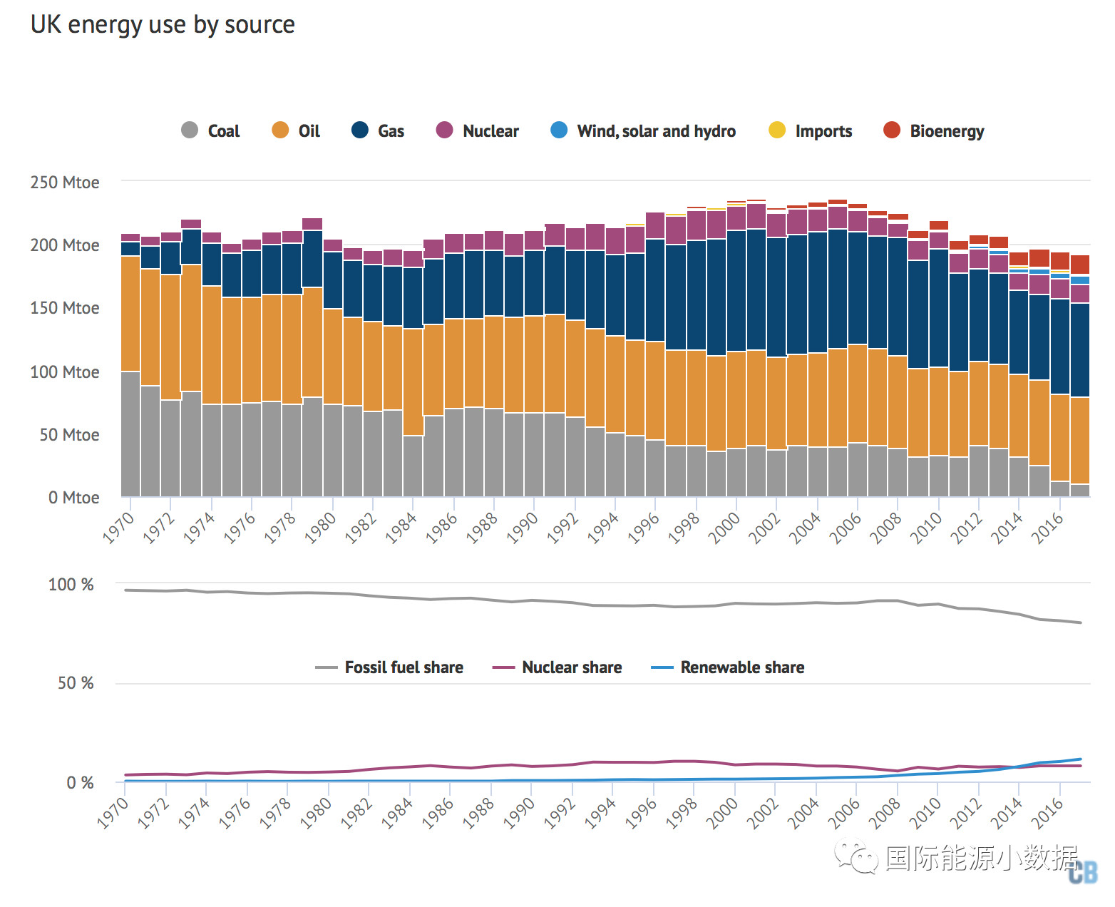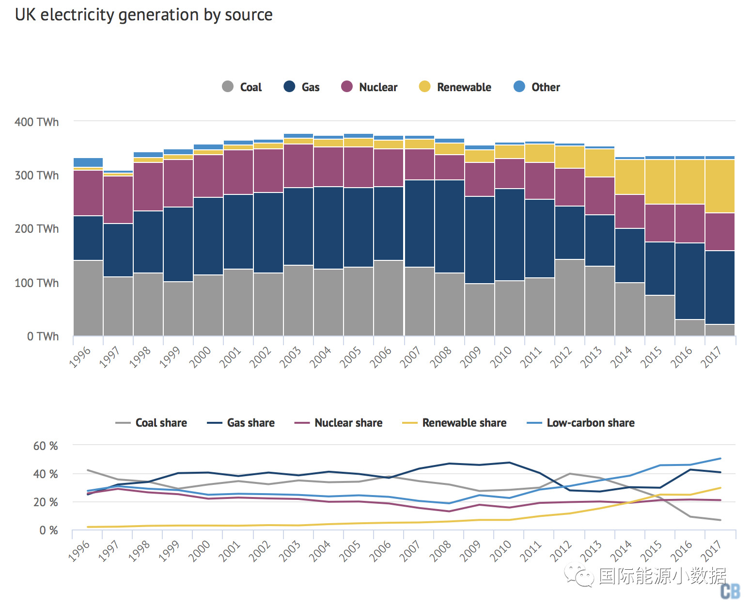 根據(jù)英國官方發(fā)布的最新能源統(tǒng)計數(shù)據(jù),2017年可再生能源發(fā)電(風(fēng)電、太陽能、水電)達到99.3 TWh(比上一年增長19.5%),占總發(fā)電量比例29.6%;天然氣發(fā)電136.7 TWh(-4.6%),占比40.7%;核電70.3 TWh(-1.9%),占比20.9%;煤電22.5 TWh(-26.5%),占比6.7%;其他電源6.8 TWh(-7.8%),占比2.0%。