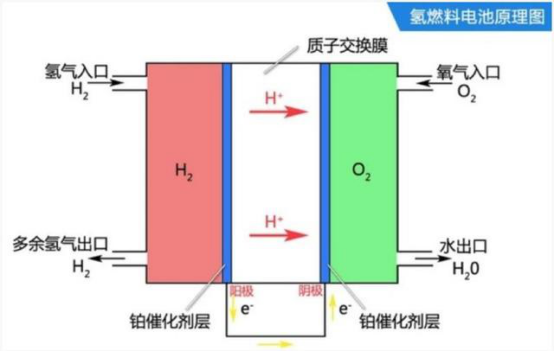 它將氫氣和氧氣分別置于陽極和陰極兩端,氫質(zhì)子穿透質(zhì)子交換膜(PEM)的孔洞與氧分子結(jié)合,在催化劑的作用下發(fā)生氧化還原反應(yīng)。同時被阻隔在膜外的電子需要繞道電極板兩端,在此過程中不經(jīng)過熱能轉(zhuǎn)換直接產(chǎn)生了電流,轉(zhuǎn)化效率高,無噪音,并生成最終唯一的反應(yīng)產(chǎn)物——水。